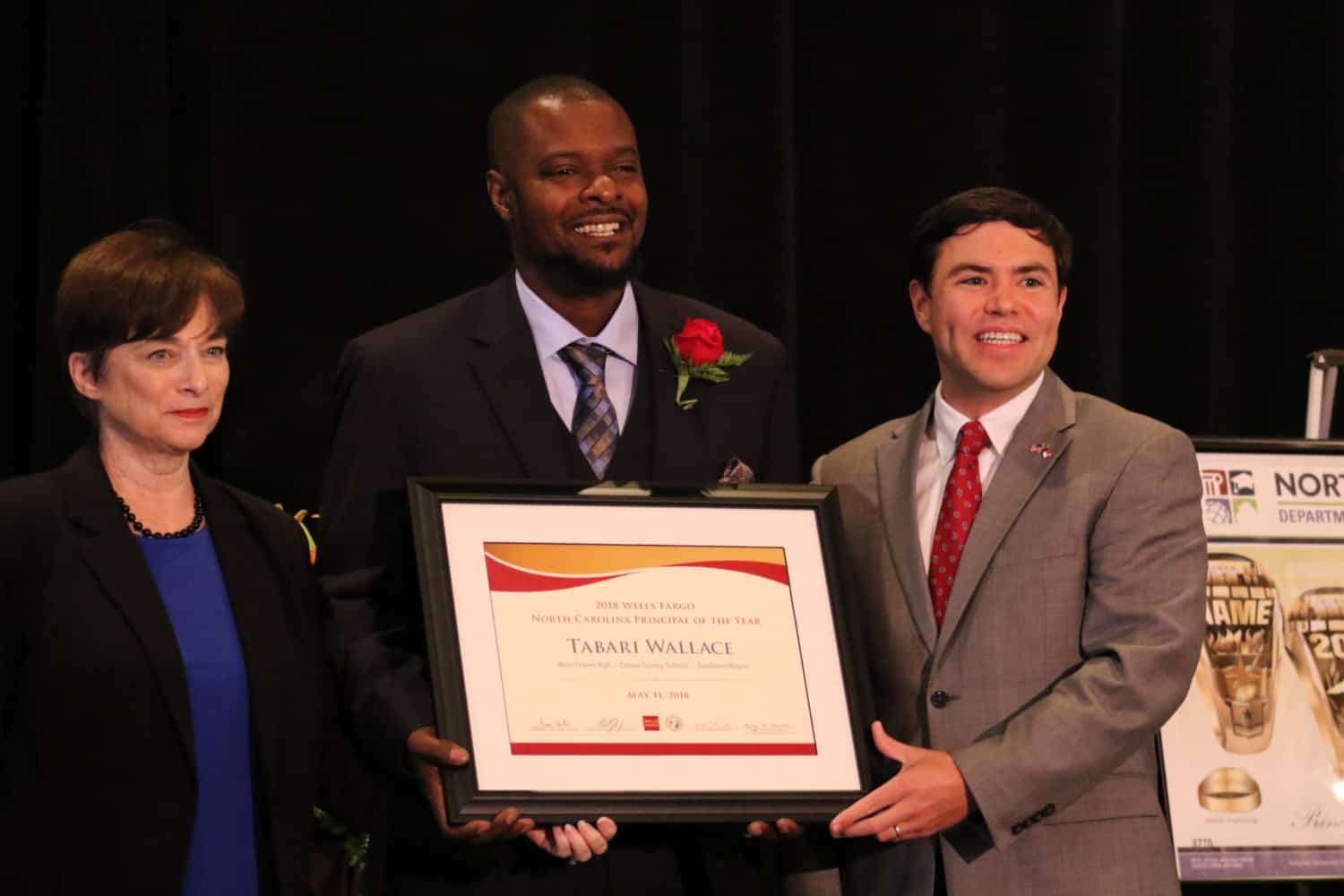 “During this person’s career, his LEA has moved him six times to different schools, each time asking … him to do what appeared to be in the impossible,” Leclair said. “Each move motivated him to work harder because, like his students, he was once told that he was two small, too short, not smart, and would not make it. We hope today that his students are inspired by the fact that their principal, Mr. Tabari Wallace … principal of West Craven High School in Craven County, is the 2018 Wells Fargo North Carolina Principal of the Year.”