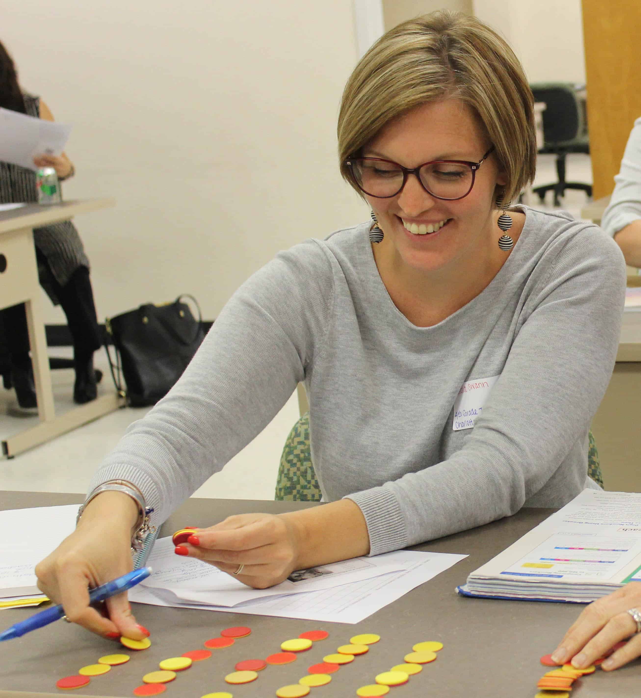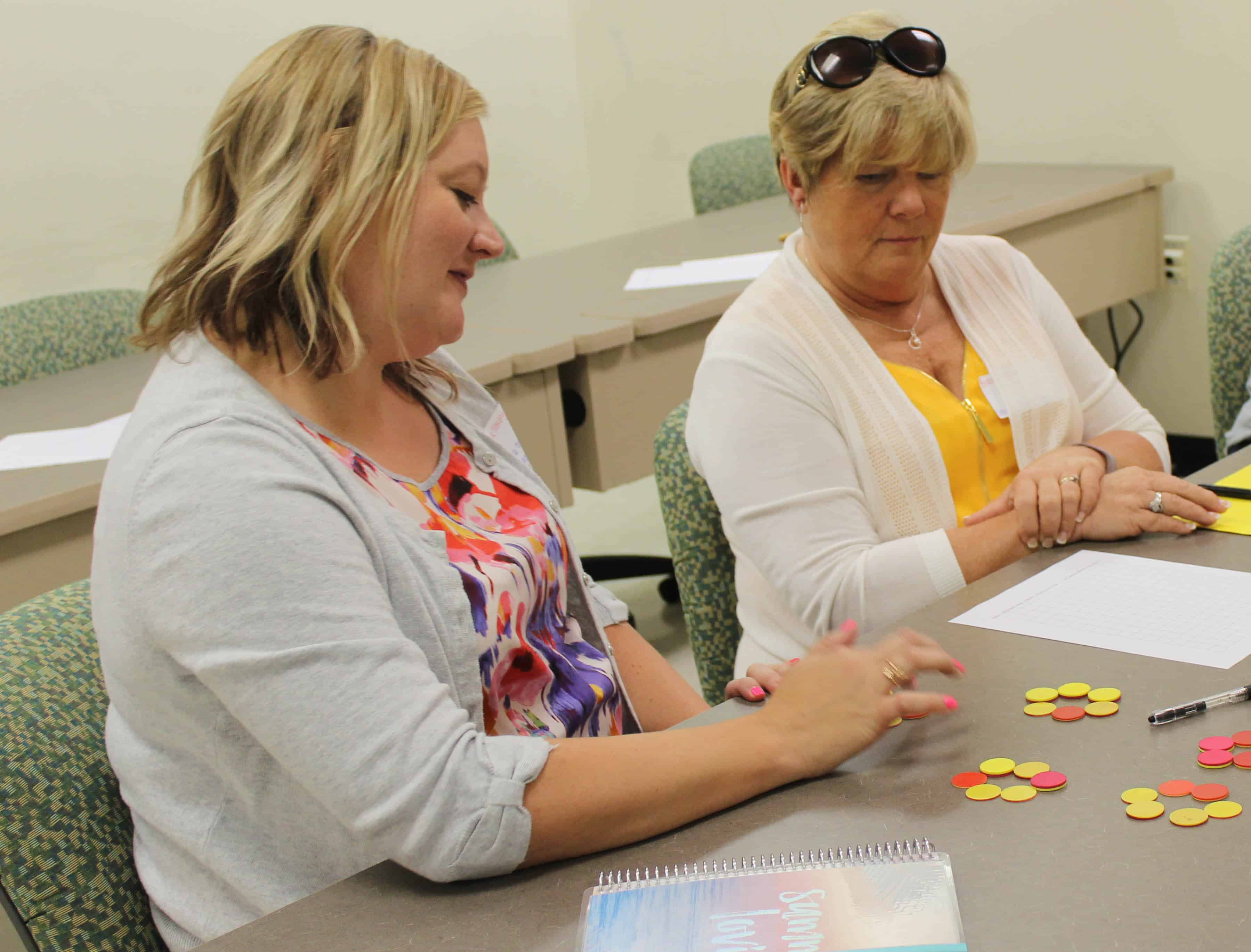Lassiter’s co-facilitator, Emily West-Dula, walked up to groups as they worked to solve a problem about shapes using token pieces. When one team finished, West-Dula said, “This is where you would say ‘Is there another way to solve this problem?'”