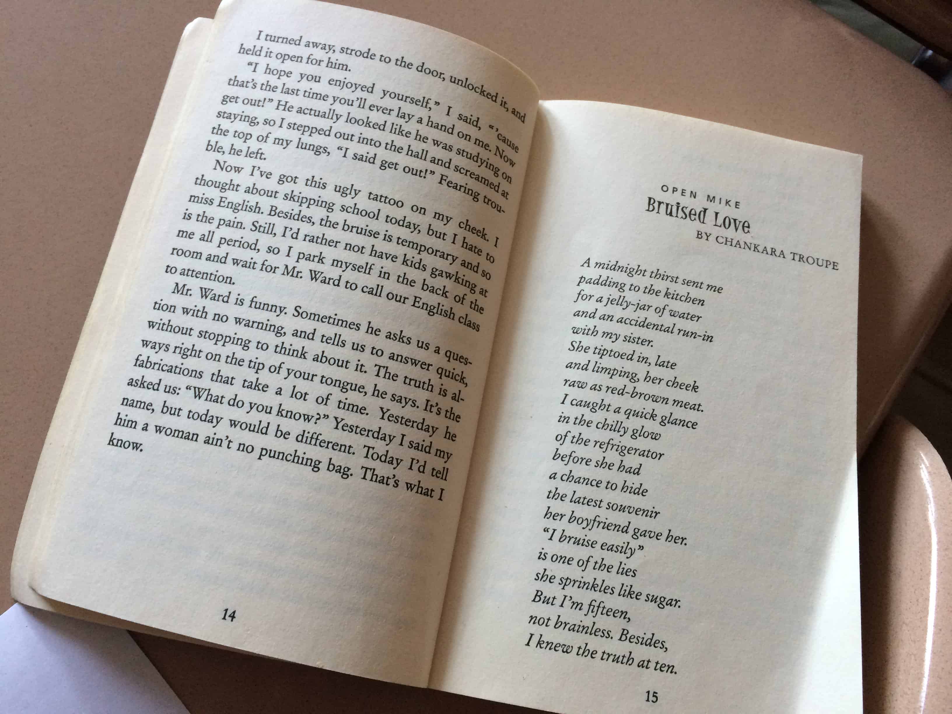 Editor’s Note: Earlier today, I was visiting Enloe High School. Kristopher White took the time to talk to me about the book, Bronx Masquerade. A ninth grader, he told me that in this book kids write poetry. He had created an inkblot, which he was using to inspire his own poetry. In the inkblot, Kristopher saw a leaf. He showed me his favorite poem in the book, saying “just as she wants to go through life more, I want to go through life more. Just like she put the girl in the mirror, I put the boy in the mirror.”