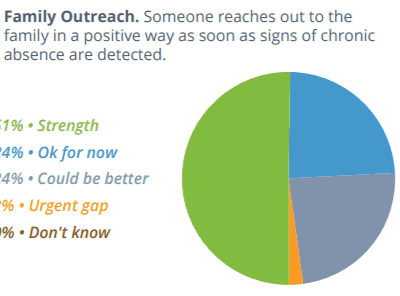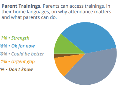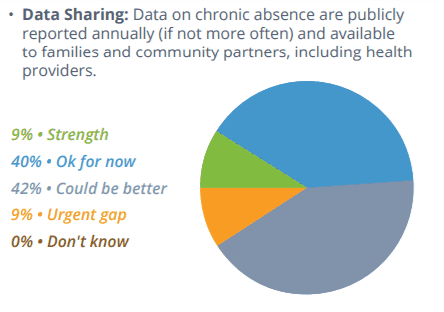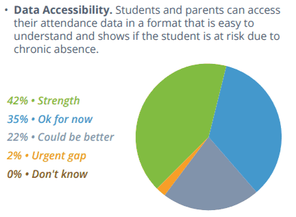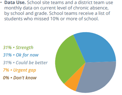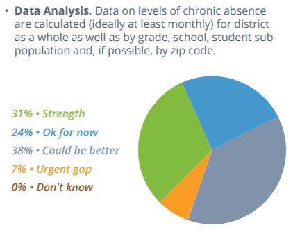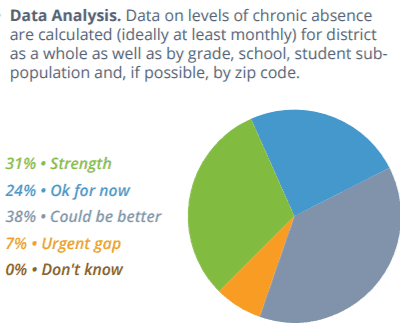 The majority of the districts reported that their data accessibility — whether students and parents can access and understand attendance data — is either a strength or okay for now. In terms of analyzing and using data, however, districts reported less confidence in their practices. Seven percent of districts said data analysis, or using attendance data to calculate chronic absence rates monthly, is an urgent gap and 38 percent said it could be better. Only 31 percent of districts reported their use of absence data to be a strength and 31 percent said it could be better.