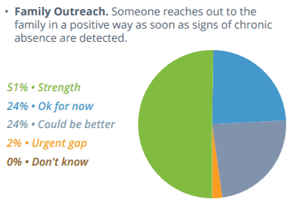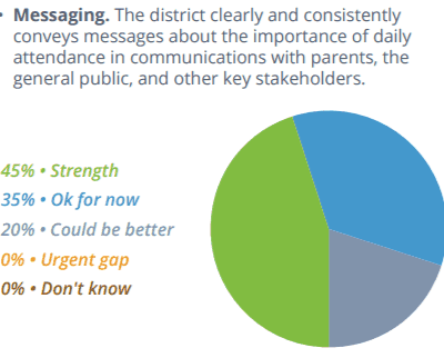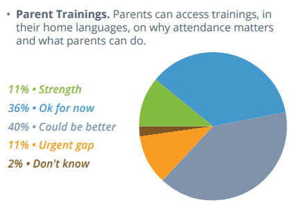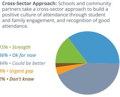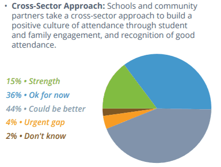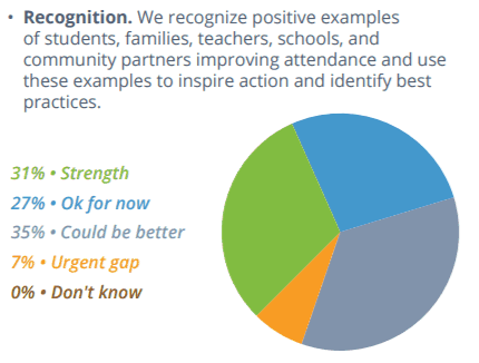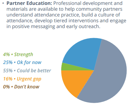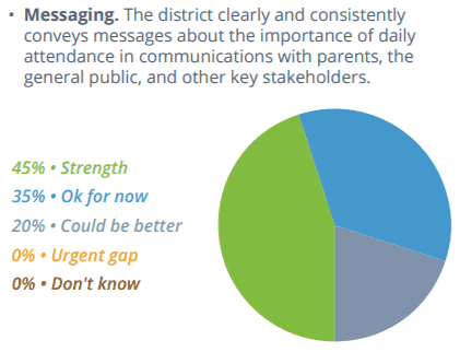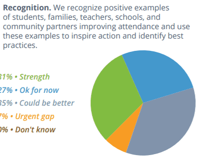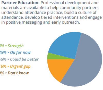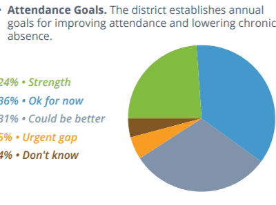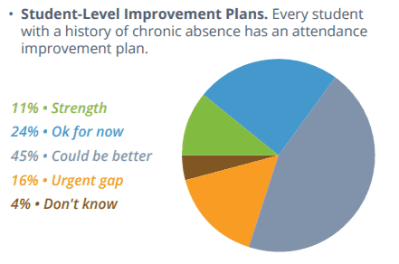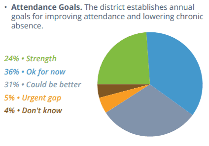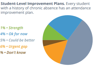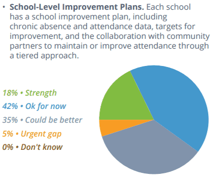 The report states, “Setting goals, making attendance a priority and building attendance metrics into accountability systems at the district, school and student levels are needed steps to realize better outcomes.” Few districts reported that setting attendance goals and creating school-level improvement plans were strengths. Instead, 31 percent said they could do better in setting attendance goals as a district, and 35 percent said they could do better creating school improvement plans that include chronic absence and attendance targets.