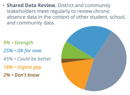 When asked to assess whether every student with a history of chronic absence has an attendance improvement plan, 16 percent of districts reported this as an urgent gap and 45 percent said they could do better. Finally, only nine percent reported shared data review between district and community stakeholders to be a strength while 45 percent said they could do better and 18 percent said it was an urgent gap.