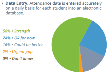 Districts are collecting data on chronic absence rates but not necessarily analyzing and using that data to inform action. Collecting data starts with entering student attendance data accurately on a daily basis. Of the 55 districts that completed the self-assessment, 58 percent reported that daily attendance data entry is a strength, 24 percent reported it is okay for now, 16 percent said it could be better, and two percent said is it an urgent gap.