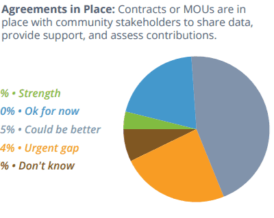 Few districts rated their ability to form cross-sector partnerships, including sharing data with those partners, to be a strength. Even fewer reported that they had contracts in place with community partners to share data, provide support, and assess contributions. In fact, one in four districts reported an urgent gap in this area.