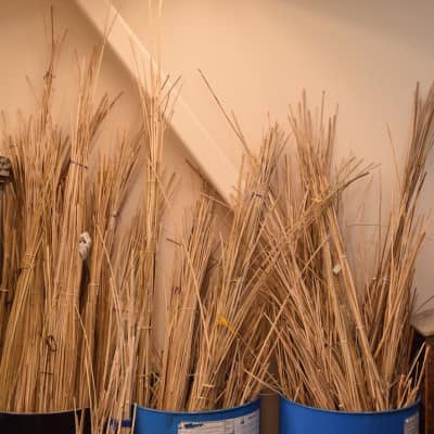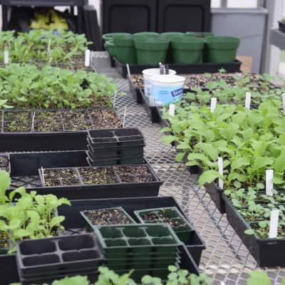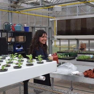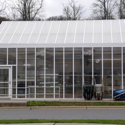 The focus on native and nutritious foods does not end in the cafeteria. Katie Rainwater with Food Corps is working in the greenhouse, tending to the hydroponic lettuce grown in coconut husks. The school would like to have a salad bar in the high school cafeteria, and they are trying to get GAP (good agricultural practice)-certified so they can use this lettuce there. Raised beds are tended by the gardening club, and blueberry bushes line this entrance to the administrative offices, with beds of ramps up behind the school on the hill. Around the campus, plants like pokeweed are grown with educational signs that teach students if the plant is medicinal, edible, poisonous, or can be used for crafts.