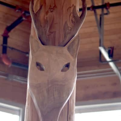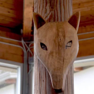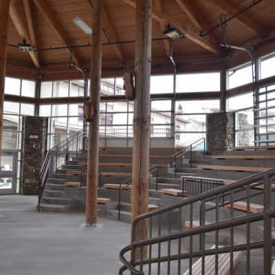 This 350-seat, open air theater in the round has seven sides to represent the seven clans in the Cherokee. These masks adorn the theater, also representing the clans.