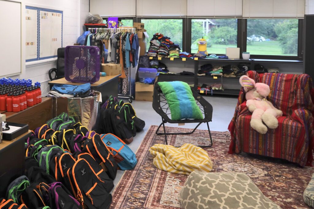 Against the window is a makeshift clothing closet. Around a partition are extra toiletries and period products. There is a refrigerator for drinks and racks for food. Wells has a cart he wheels around the hallways for students to grab mid-afternoon snacks. In the middle of the room, there are bean bags for a hangout space.