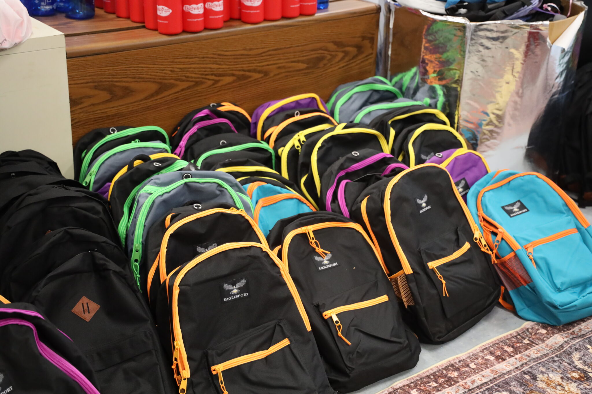 Against the window is a makeshift clothing closet. Around a partition are extra toiletries and period products. There is a refrigerator for drinks and racks for food. Wells has a cart he wheels around the hallways for students to grab mid-afternoon snacks. In the middle of the room, there are bean bags for a hangout space.