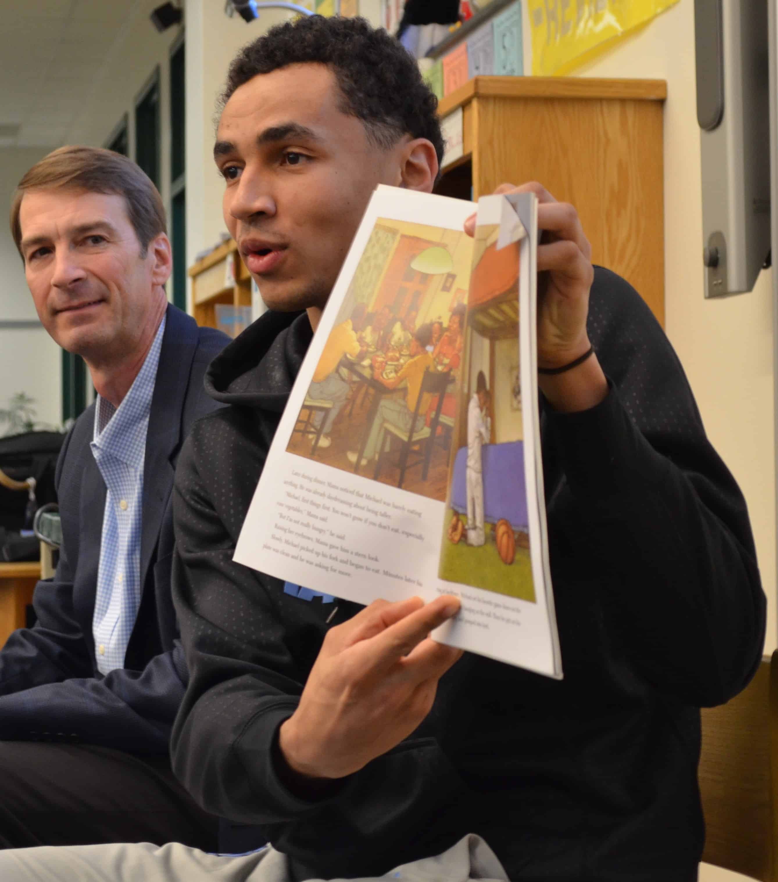 Both Paige and Fountain took turns reading to the students from the book, “Salt in His Shoes: Michael Jordan in Pursuit of a Dream.”