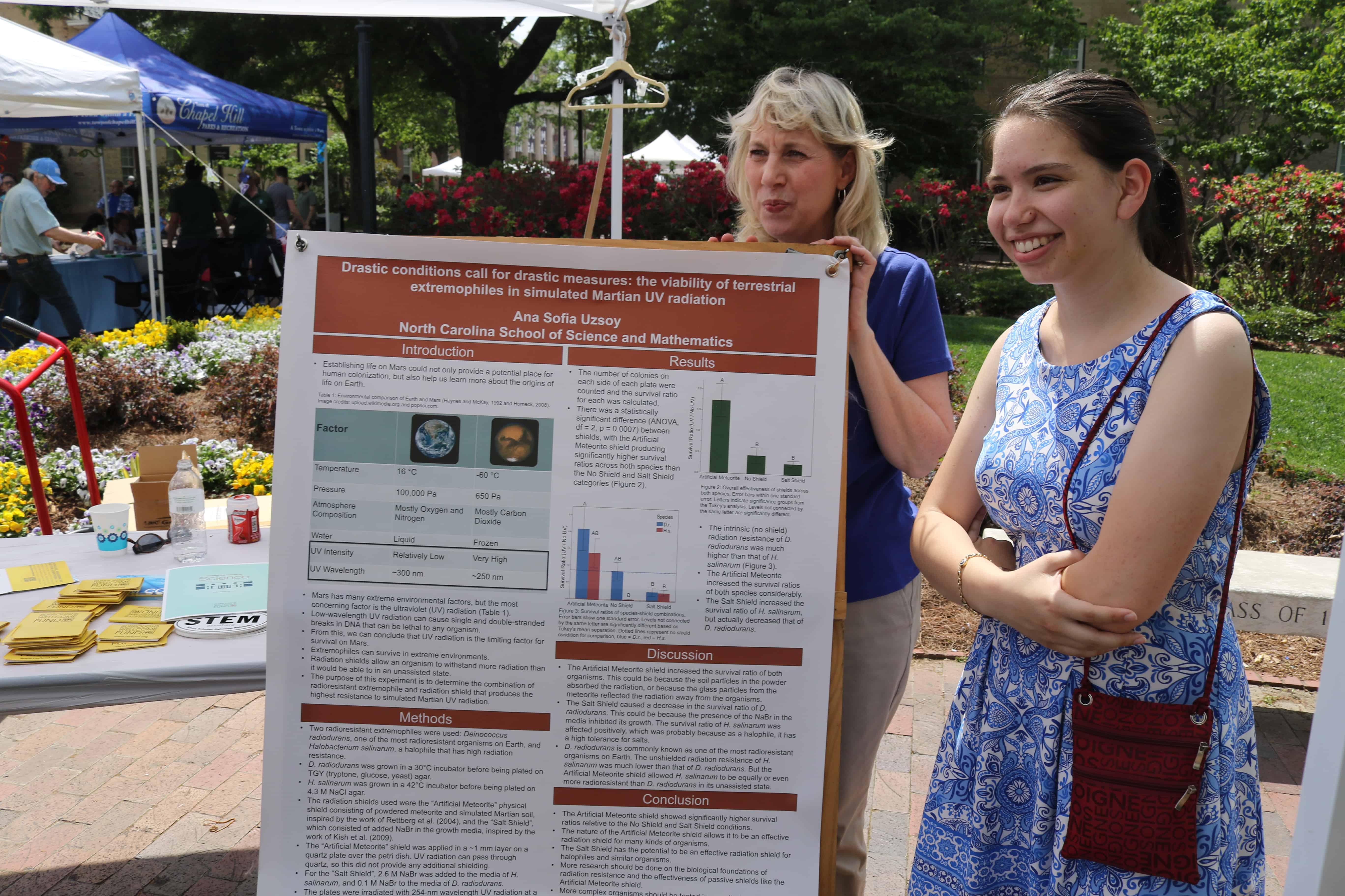 Ana Sofia Uzsoy, a senior at the North Carolina School of Science and Mathematics (NCSSM), patiently explained what this question meant, how she tackled it, and the answers, to person after person on Saturday at the 2017 UNC Science Expo.
