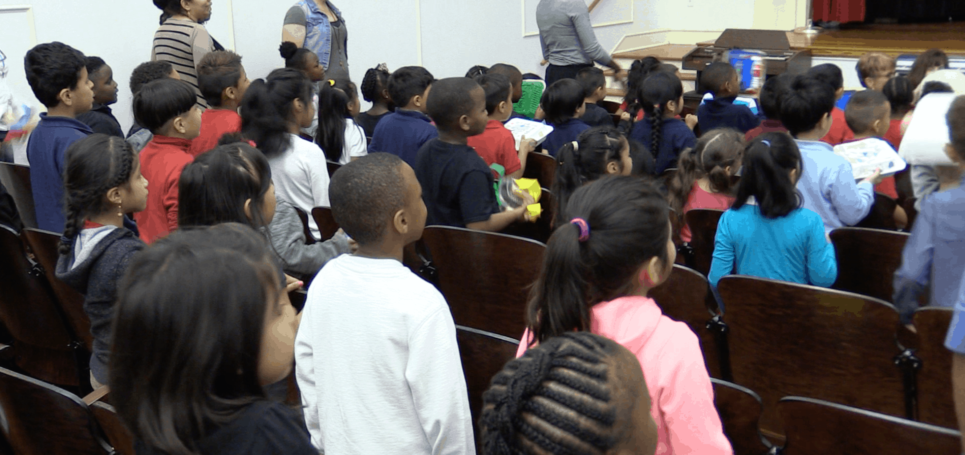 Students listened to some of their fellow classmates serenade them with violins as they filed into the auditorium. They sang “This Little Light of Mine” in a musical jam session. And they had the chance to dance in the aisles along with the faculty of their school. See the video at the bottom of the page for highlights from the event.