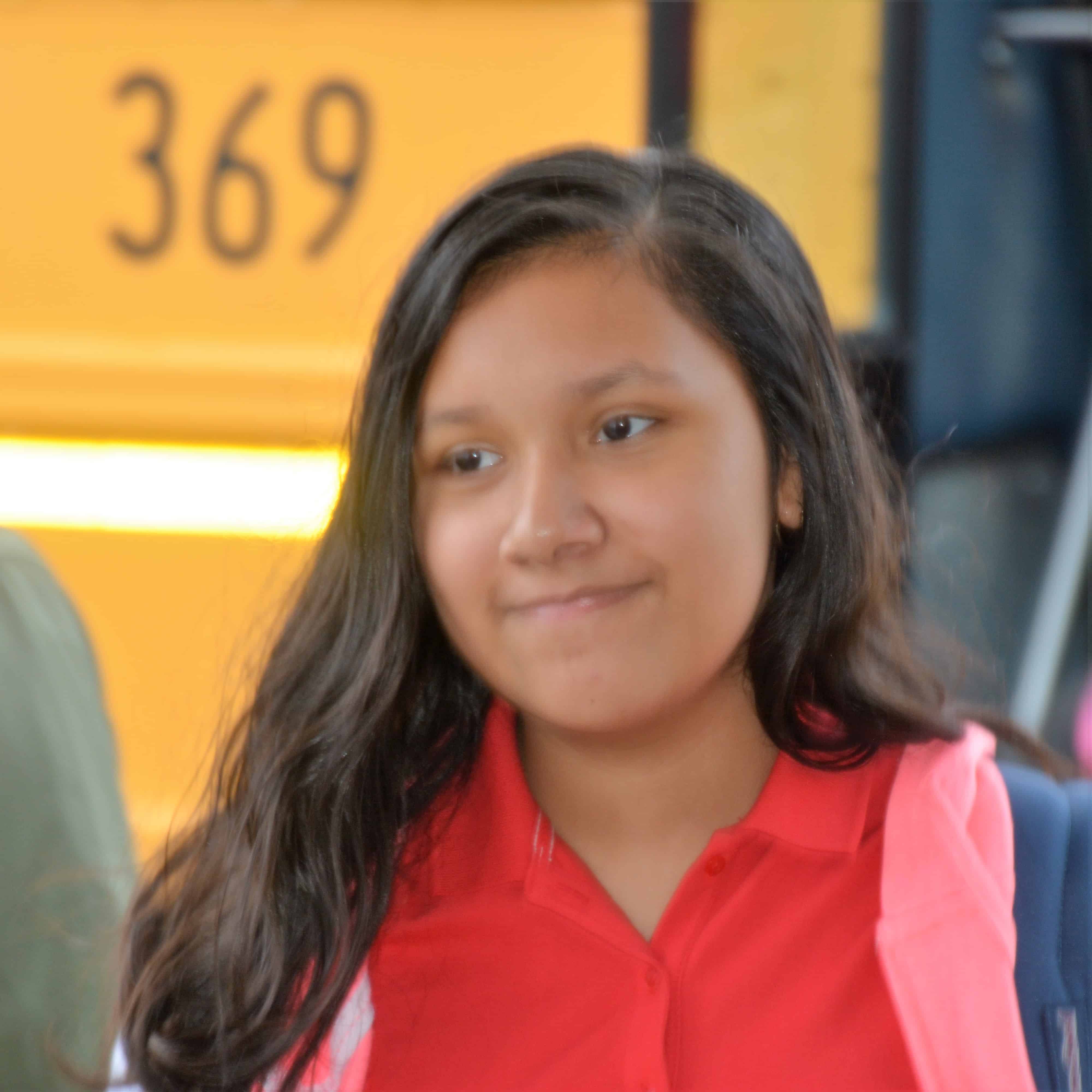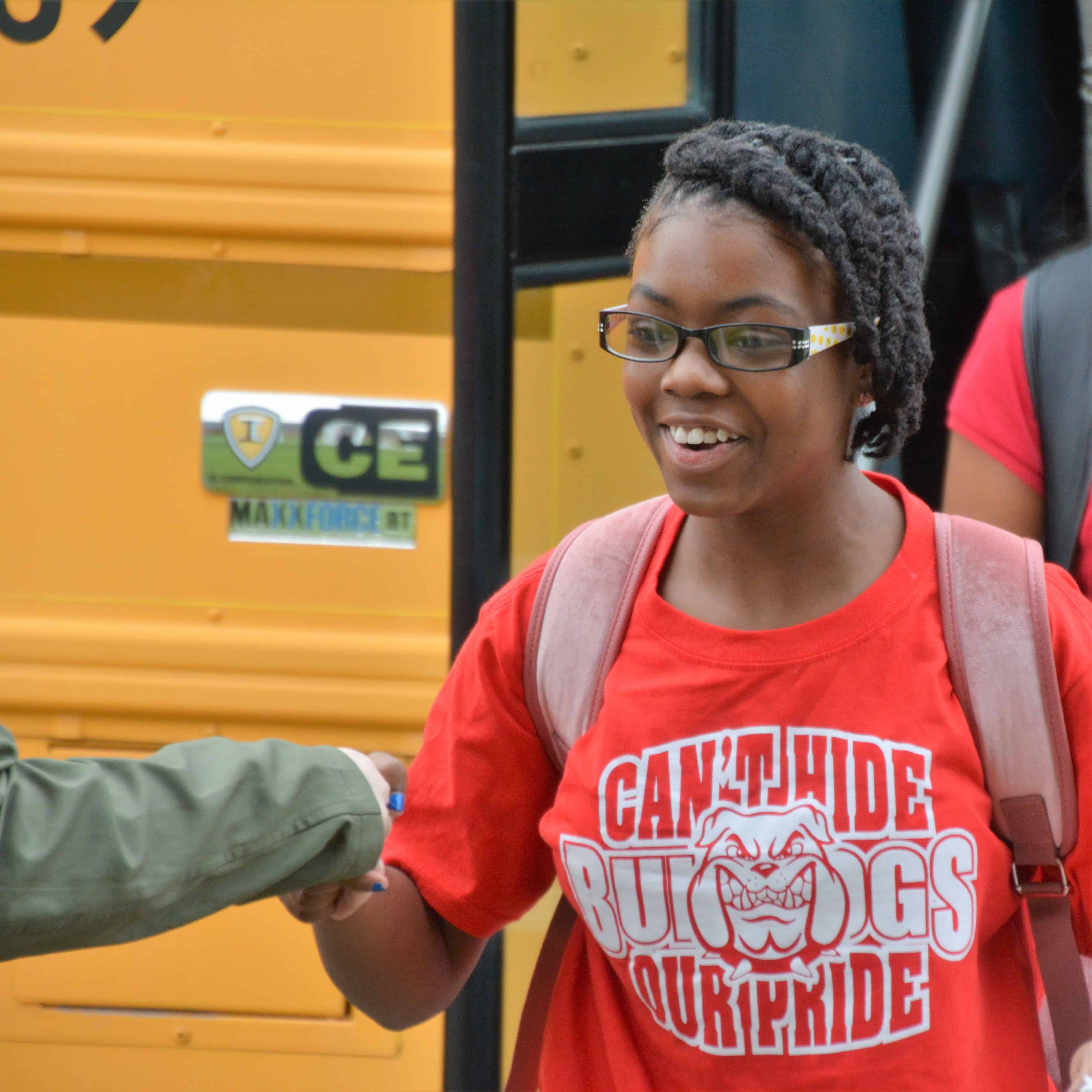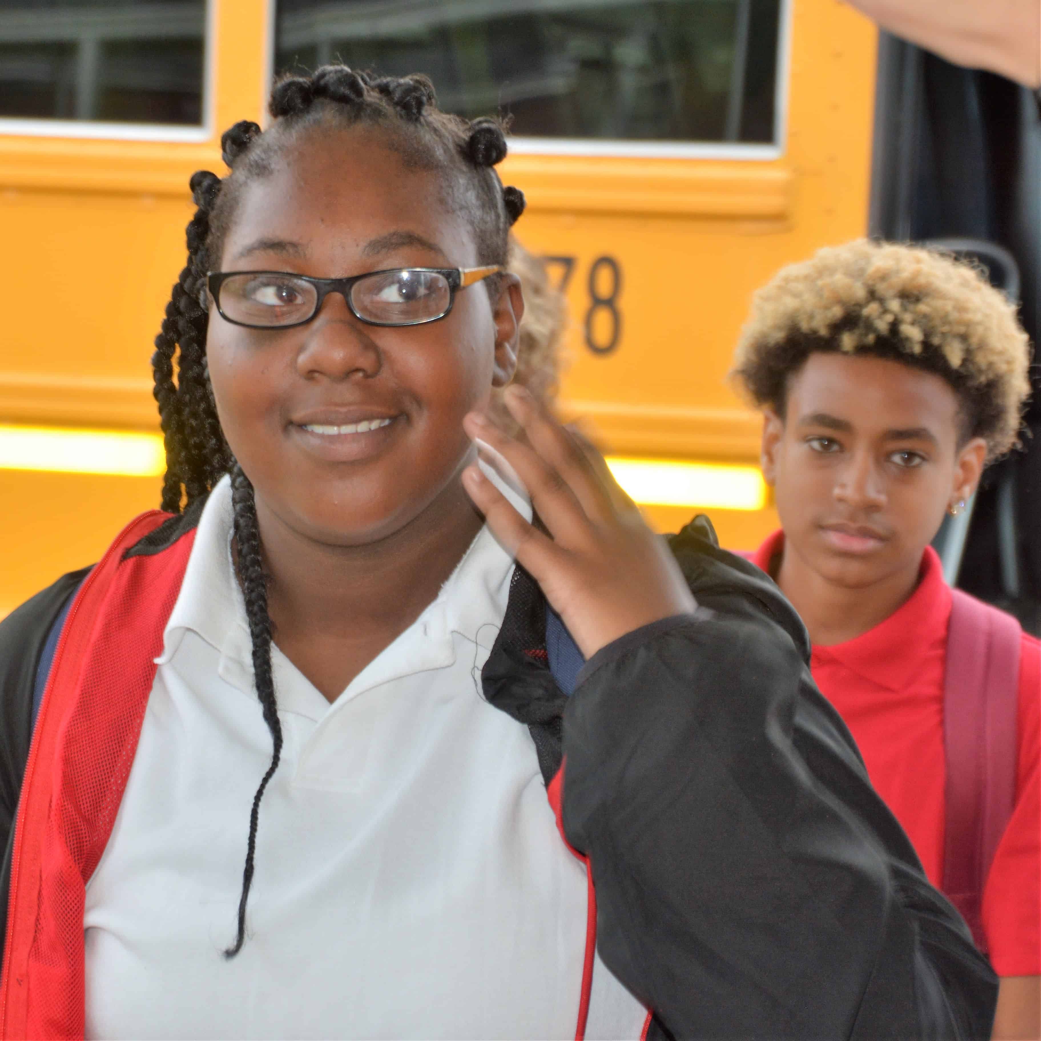 Greeting Miracle and other students as they get off the bus.