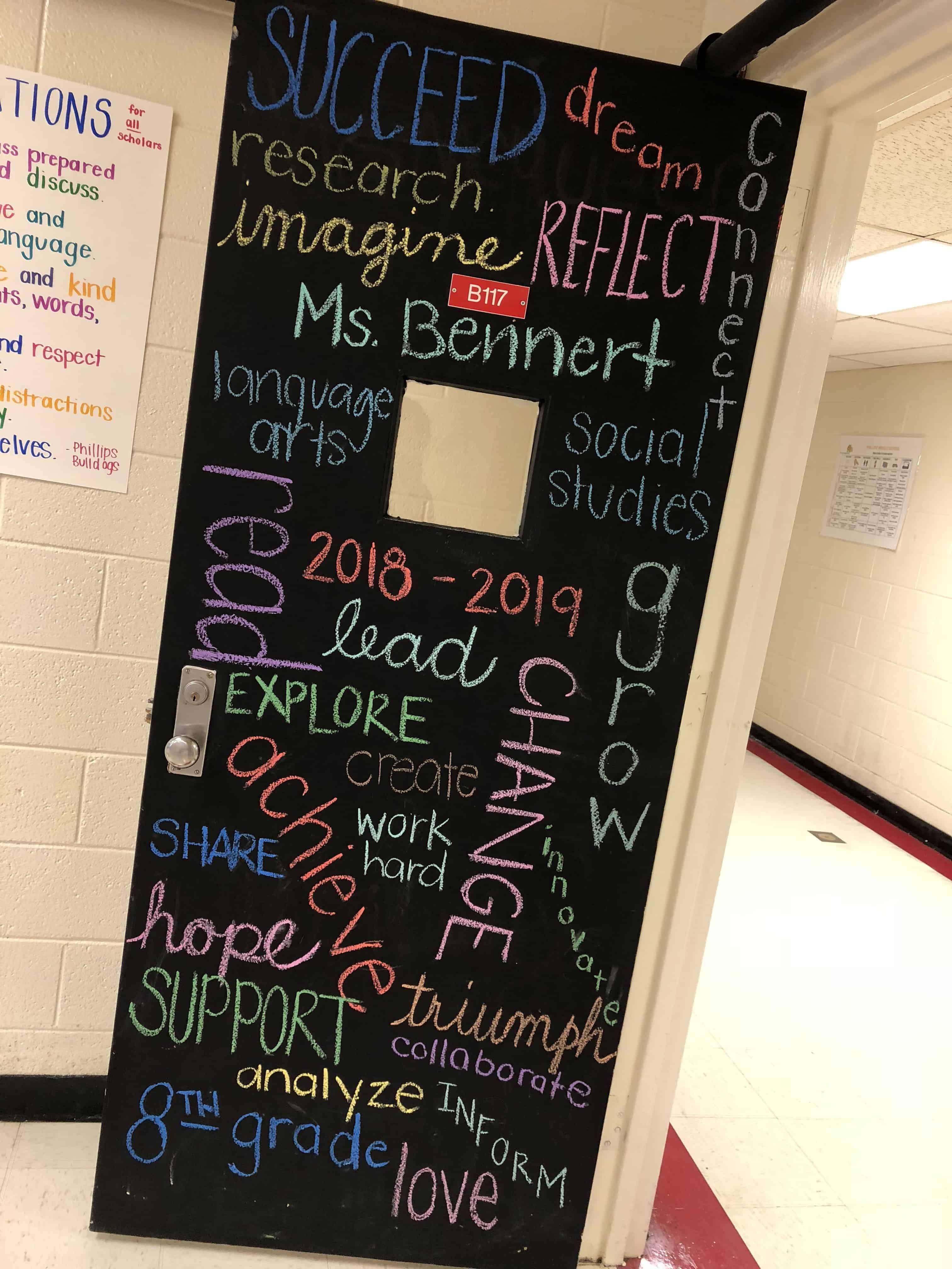 The doors have been painted with black chalkboard paint, and the teachers have put their own mark on them using colored chalk to inspire.
