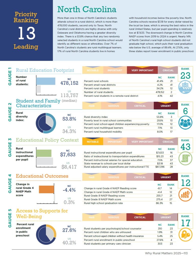 The report includes state-by-state rankings. North Carolina ranks 2nd in the country for the number of rural students served, according to the report. More than 7% of our students are rural multilingual learners, ranking 13th. Only three states report lower rural enrollment in public preschool.